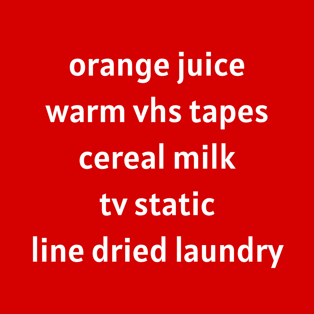 notes: florida orange juice, warm video tapes, sweet cereal milk, tv static, line dried laundry